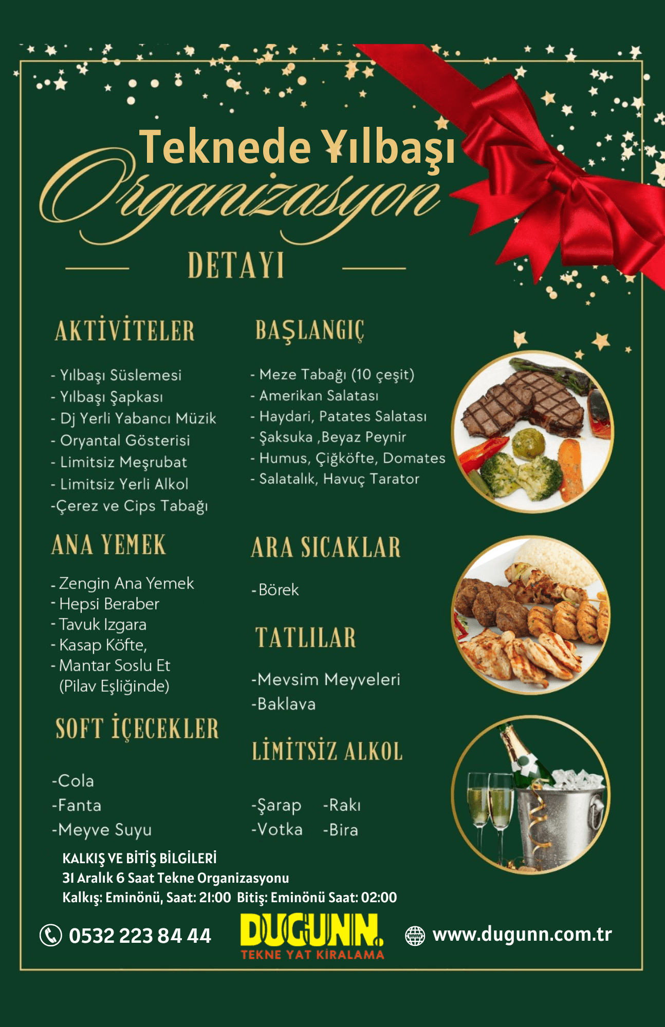 Sınırlı kontenjan ile gerçekleştirdiğimiz yılbaşı teknede eğlence etkinliklerimizde, misafirlerimize yüksek kalitede hizmet sunmayı hedefliyoruz. Her detayın özenle planlandığı bu özel gece için, yerinizi ayırtmayı unutmayın!