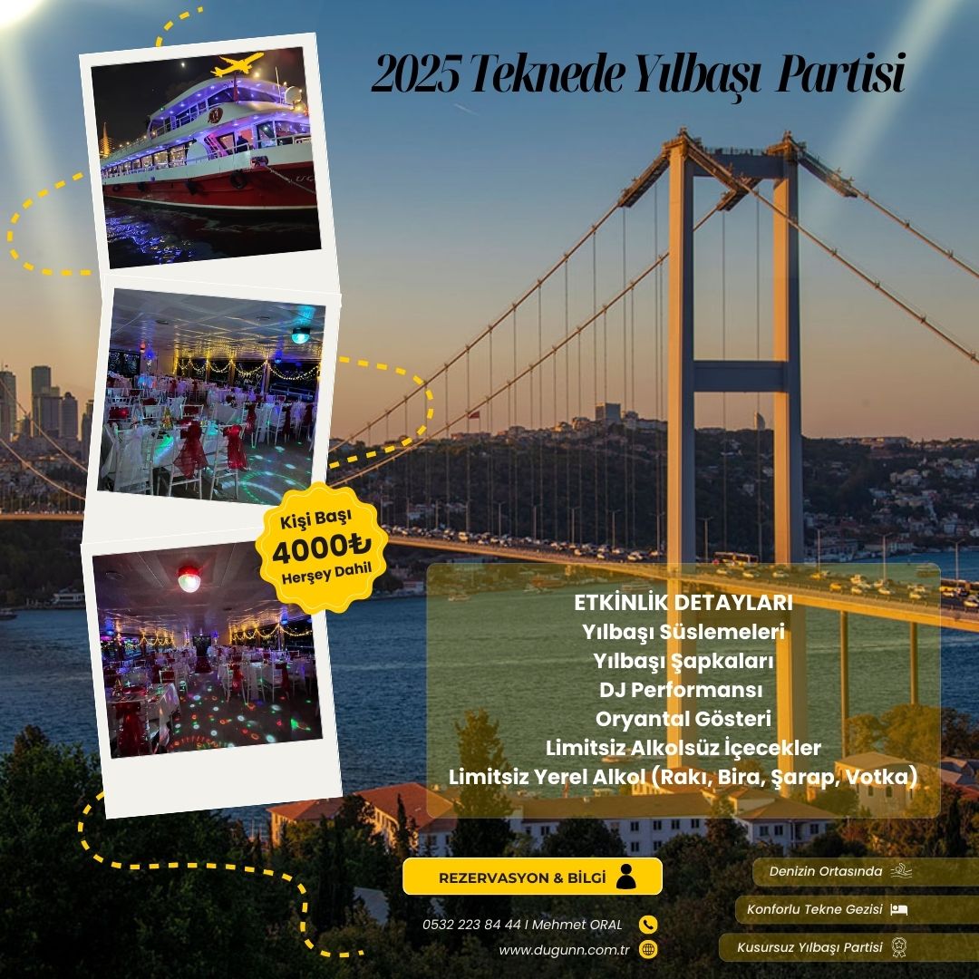 İstanbul’da teknede yılbaşı kutlaması, şehrin ışıkları ve muhteşem silueti eşliğinde tam anlamıyla büyüleyici bir atmosfer sunar. Bu özel gecede; canlı DJ performansları, yerli ve yabancı müziklerle dolu eğlenceli saatler, lezzetli yılbaşı menüsü ve sınırsız içecek seçenekleriyle tüm gece sürecek bir eğlence sizi bekliyor. Aynı zamanda Boğaz'dan izleyebileceğiniz havai fişek gösterileri, bu özel geceyi unutulmaz kılmak için harika bir detay! İstanbul teknede yılbaşı partisi ile sevdiklerinizle birlikte Boğaz’ın benzersiz güzelliklerini izlerken, yeni yıla unutulmaz anılar biriktirerek gireceksiniz.